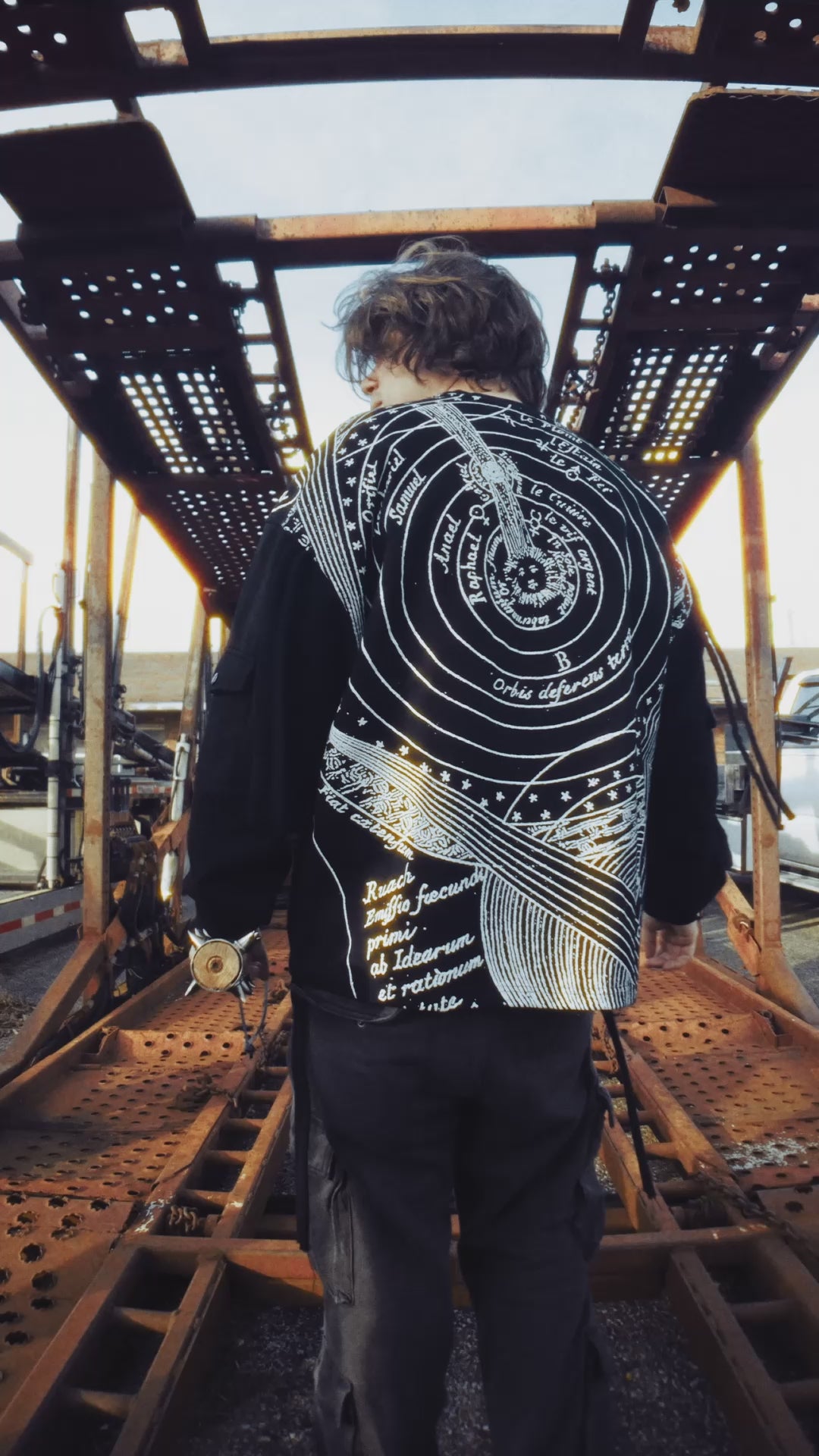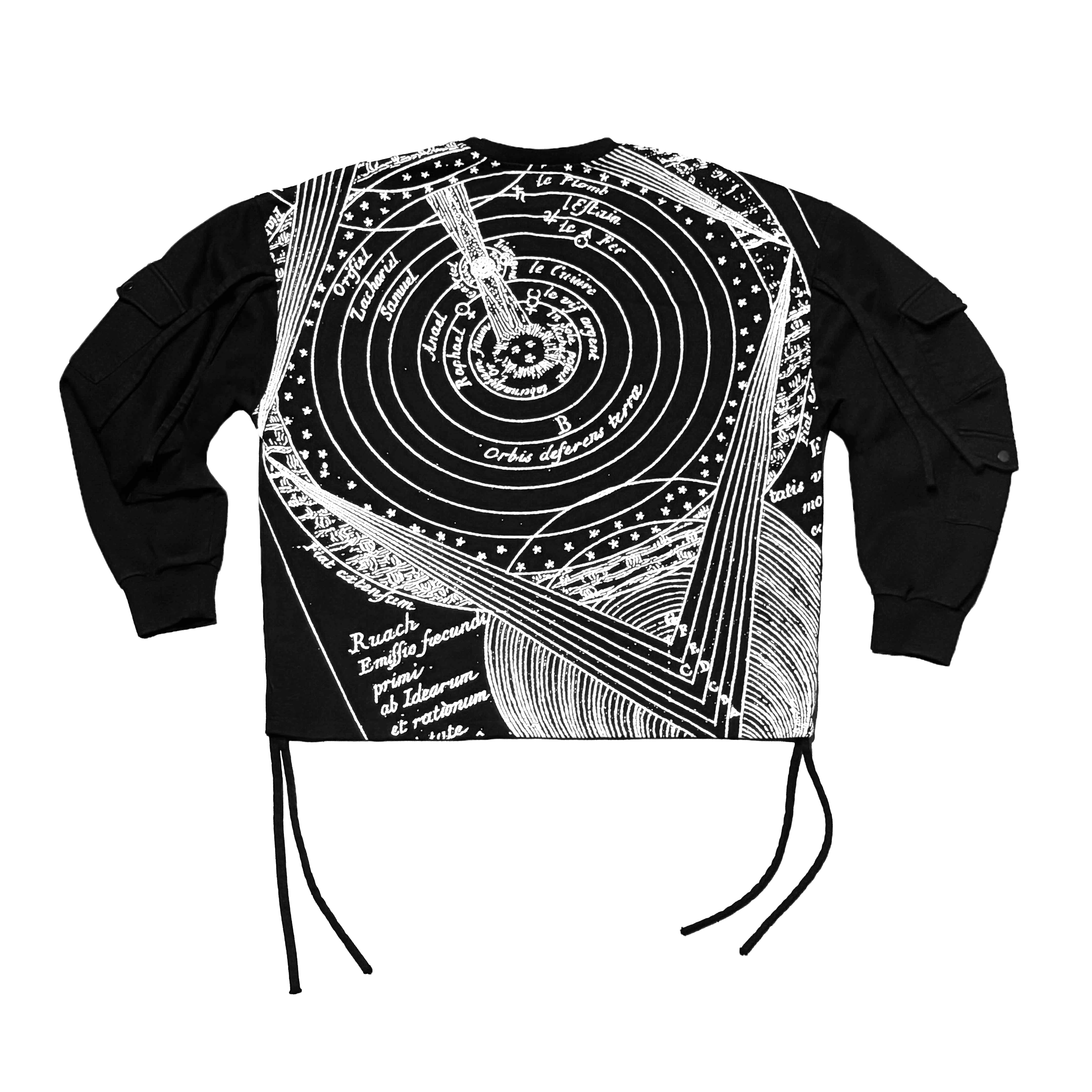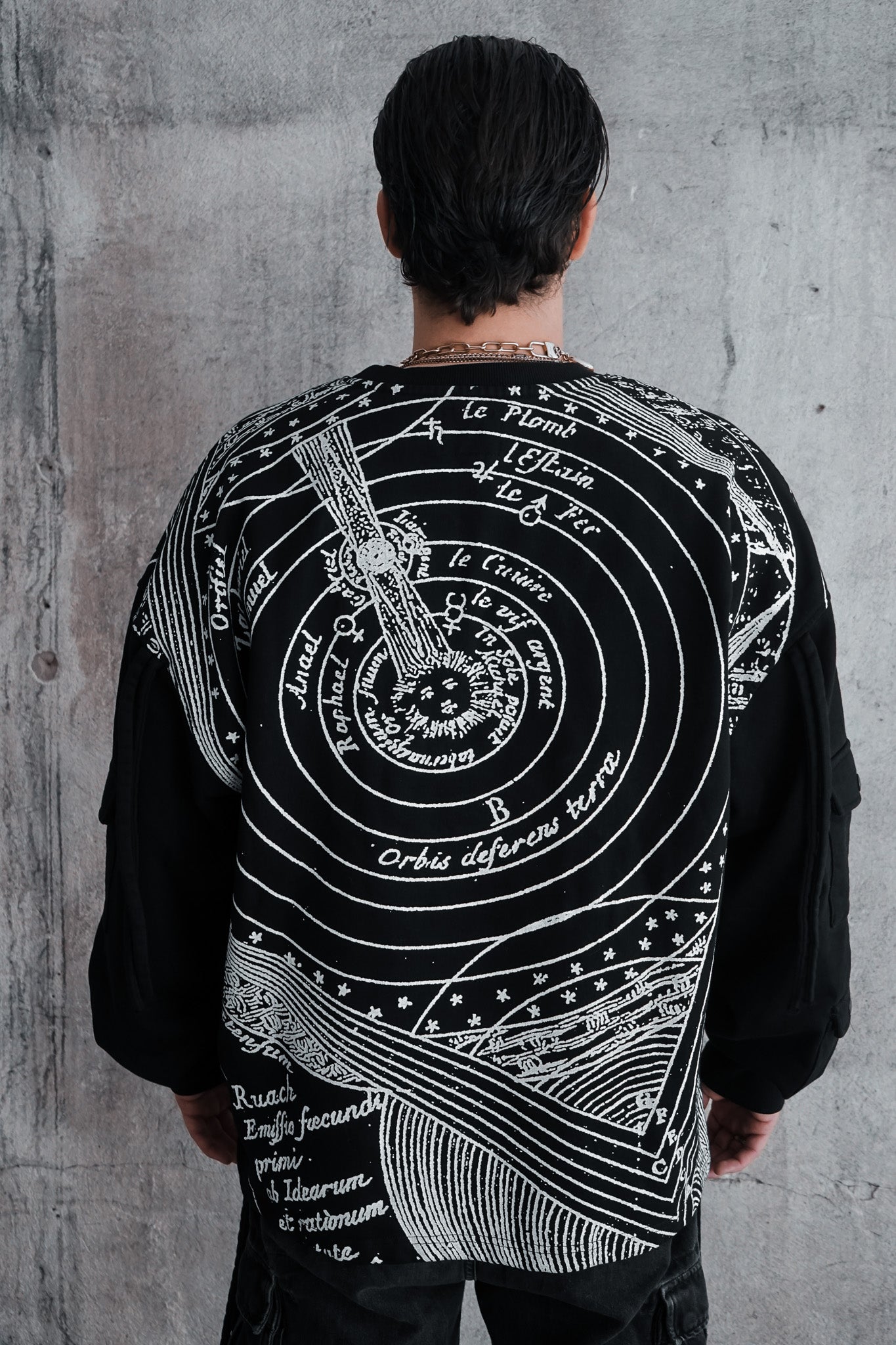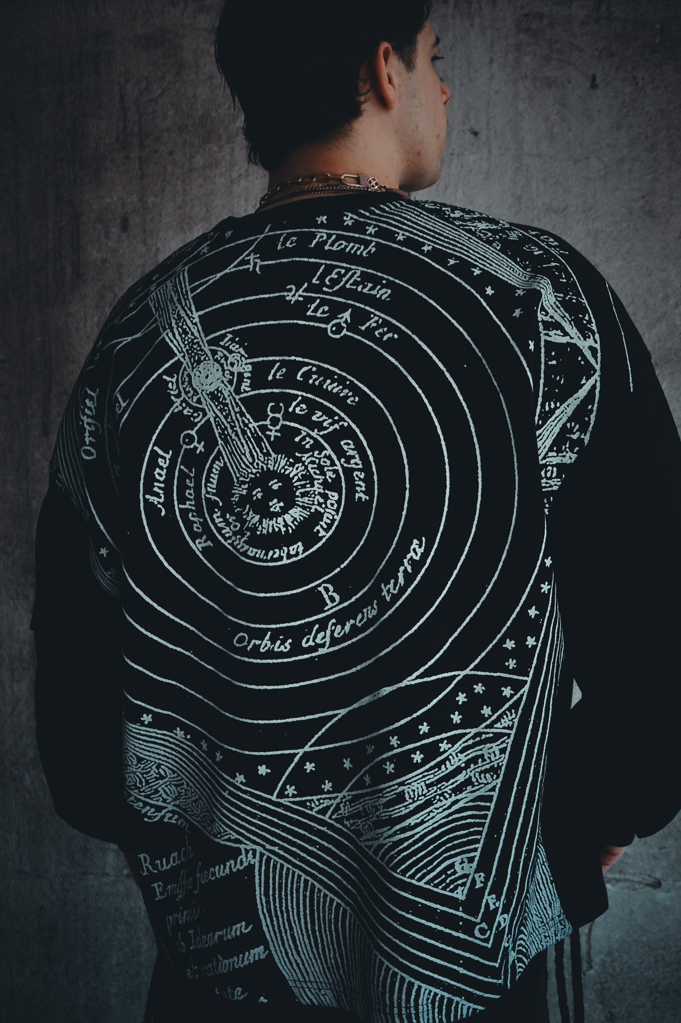 An ancient map of the solar system is bonded into the back of the garment. The image sits in the fabric, not on top of it.