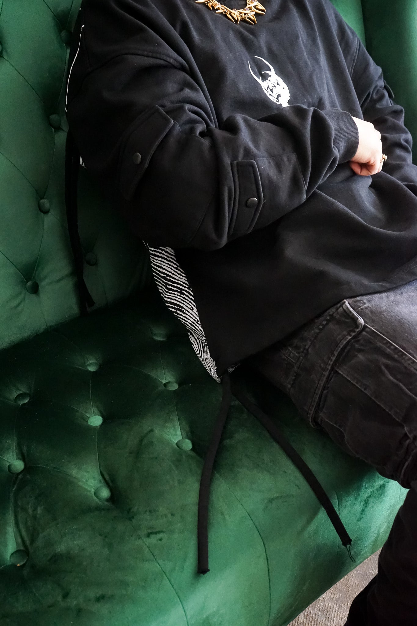 Asymmetrical sleeve pockets, two on the right, one on the left, finished with YKK snaps.